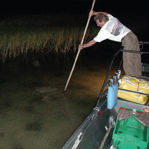 The simplicity of gigging also appeals to Captain Rick, as he doesn’t have to worry about rod and reels, hooks, lures, or bait. He keeps his special gear in good shape and can repair or replace any items he needs to, since it’s all homemade. Being alone on the water at night means safety is important and Rick takes that seriously, stocking extra supplies to ensure he is prepared for anything.
